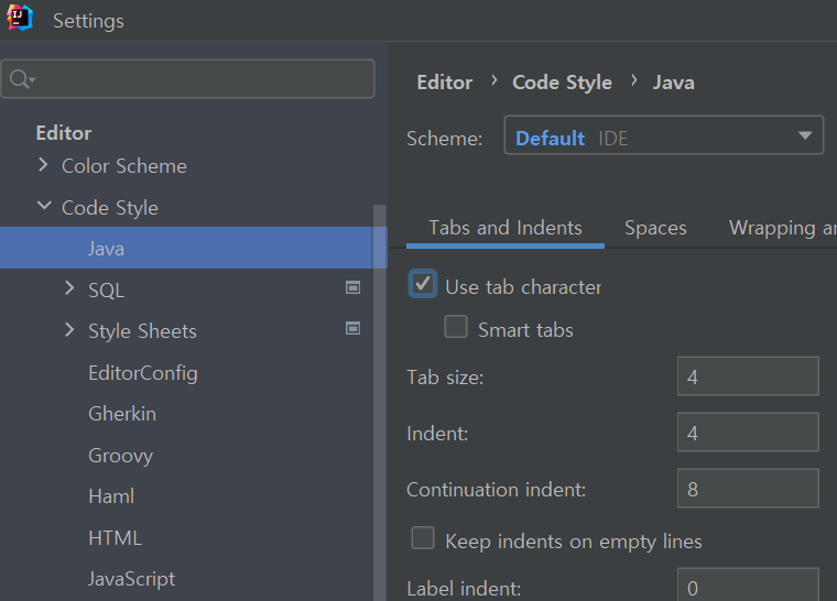 - File > Settings > Editor > Code Style > Java 메뉴로 이동한다.
