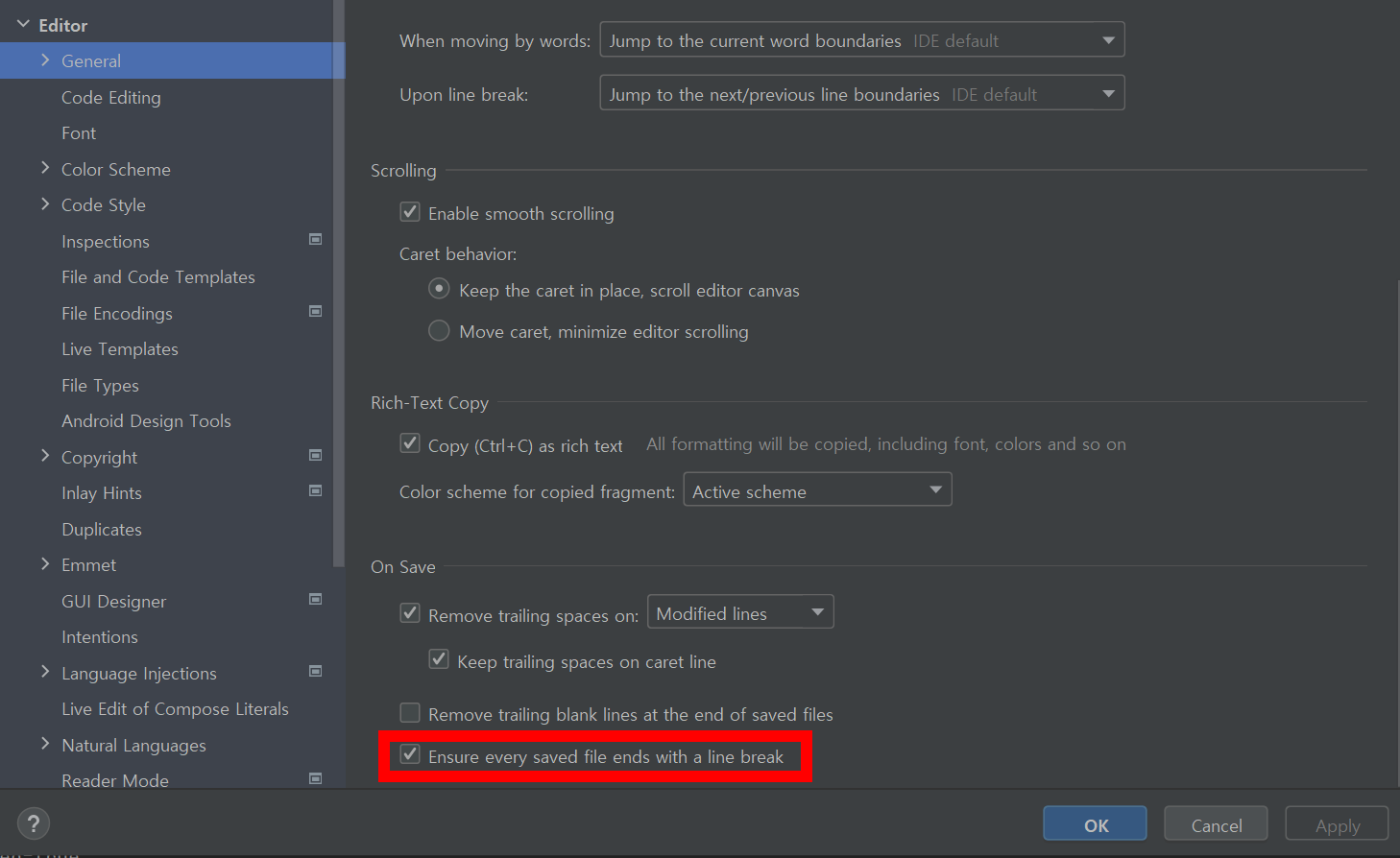 현재의 세팅을 보았을 때 비쥬얼 스튜디오의 경우 LF, 인텔리J의 경우 CRLF가 기본 설정으로 되어 있는 것을 확인했다.
