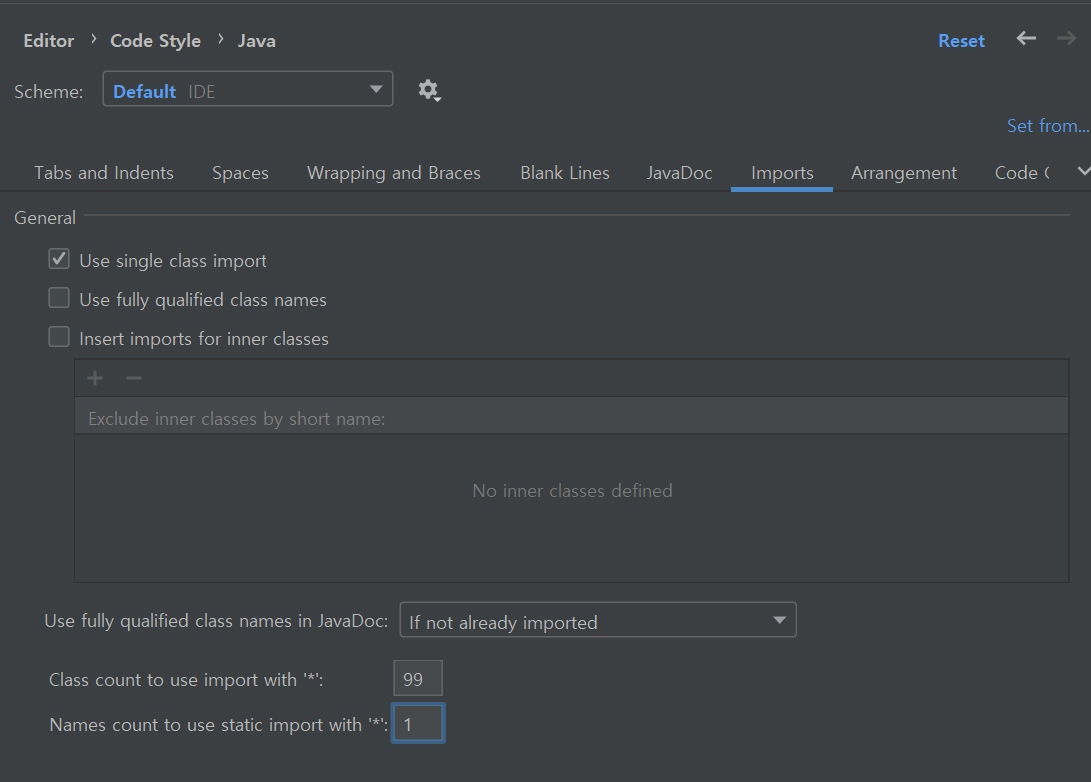 - File > Settings > Editor > Code Style > Java 메뉴로 이동