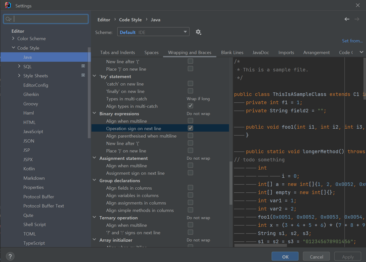 - Binary expressions 아래의 Operation sign on next line 항목을 선택한다.