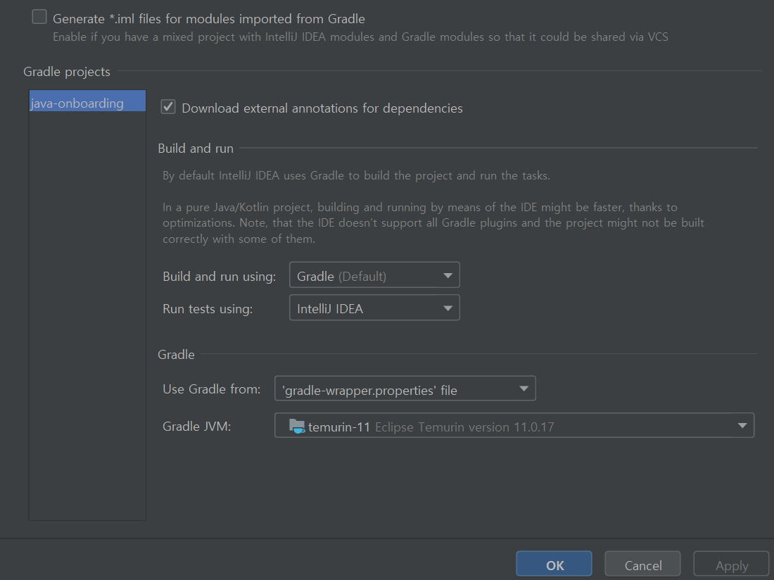 세팅에서 gradle build 환경을 바꾸어주는 것으로도 해결되지 않았고 어느 순간에는 잘 작동되던 테스트마저도 갑자기 전부 실행이 되지 않았다.