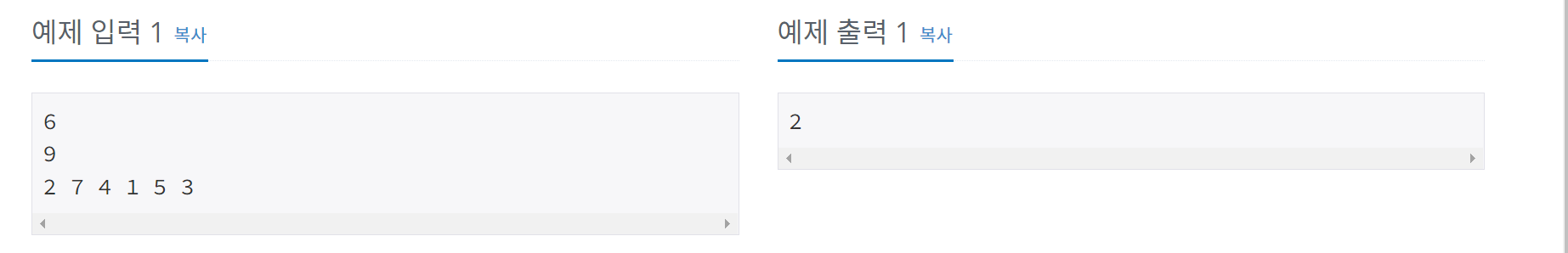 첫째 줄에는 재료의 개수 N(1 ≤ N ≤ 15,000)이 주어진다. 그리고 두 번째 줄에는 갑옷을 만드는데 필요한 수 M(1 ≤ M ≤ 10,000,000) 주어진다. 그리고 마지막으로 셋째 줄에는 N개의 재료들이 가진 고유한 번호들이 공백을 사이에 두고 주어진다. 고유한 번호는 100,000보다 작거나 같은 자연수이다.