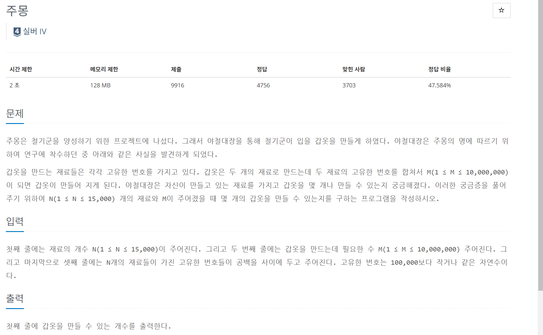 갑옷을 만드는 재료들은 각각 고유한 번호를 가지고 있다. 갑옷은 두 개의 재료로 만드는데 두 재료의 고유한 번호를 합쳐서 M(1 ≤ M ≤ 10,000,000)이 되면 갑옷이 만들어 지게 된다.