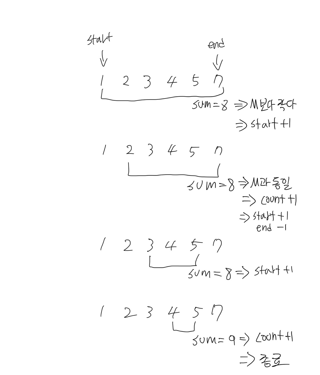 투포인터를 양 끝에 설정하는 것으로 시작한다. 처음을 i, 끝을 j 로 설정한 뒤, 포인터를 이동시키면서 합이 M을 만족시키면 count를 증가시키고, i와 j가 만날때까지 반복한다.