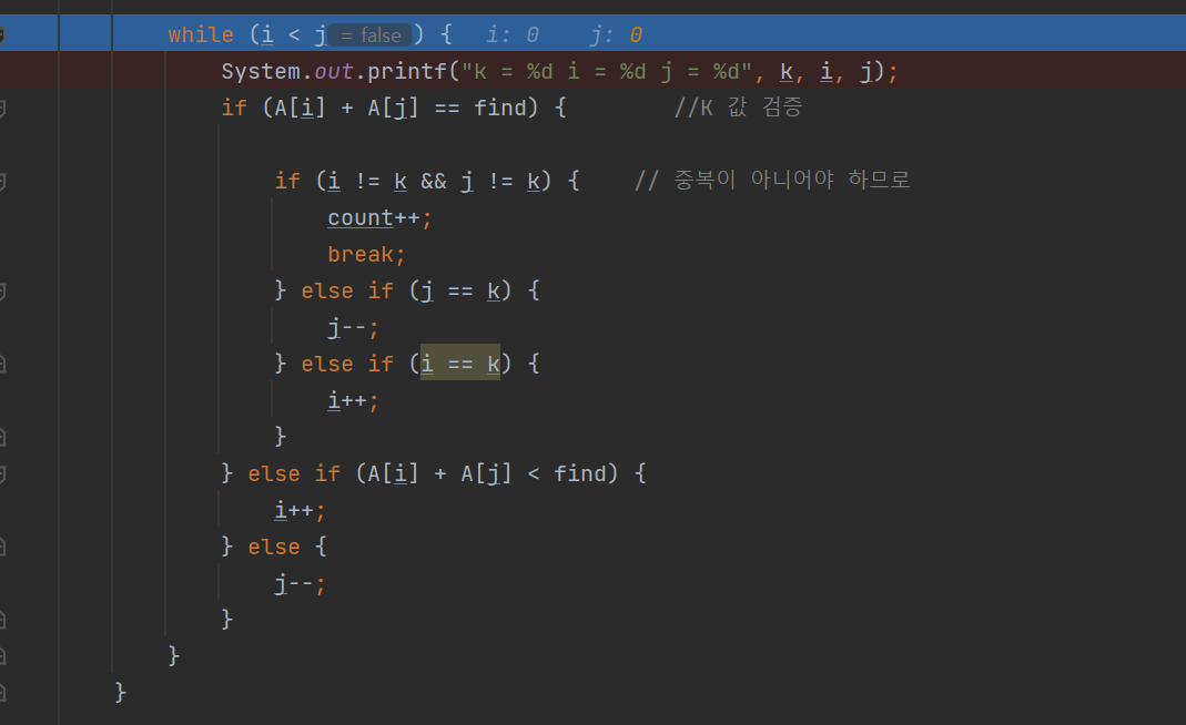 if (A[i] + A[j] == find) { //K 값 검증