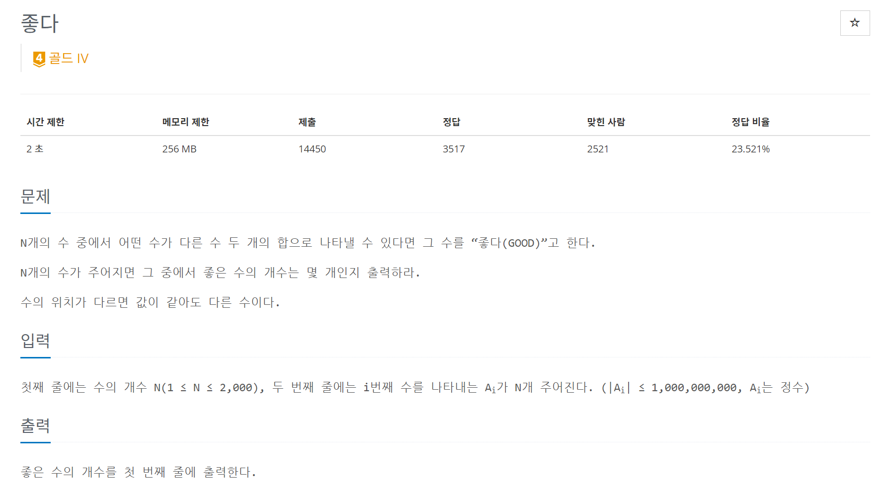 N개의 수 중에서 어떤 수가 다른 수 두 개의 합으로 나타낼 수 있다면 그 수를 “좋다(GOOD)”고 한다.