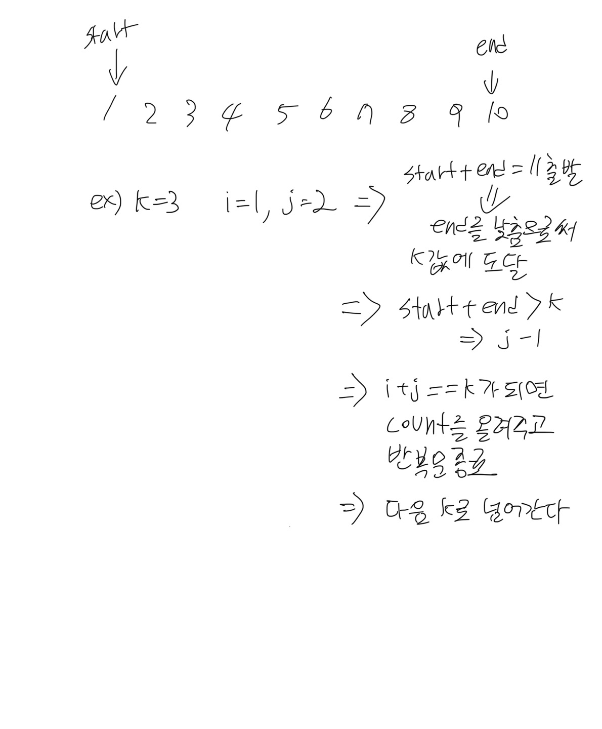 2) start + end > K : 좋은 수가 없으므로 => j--;