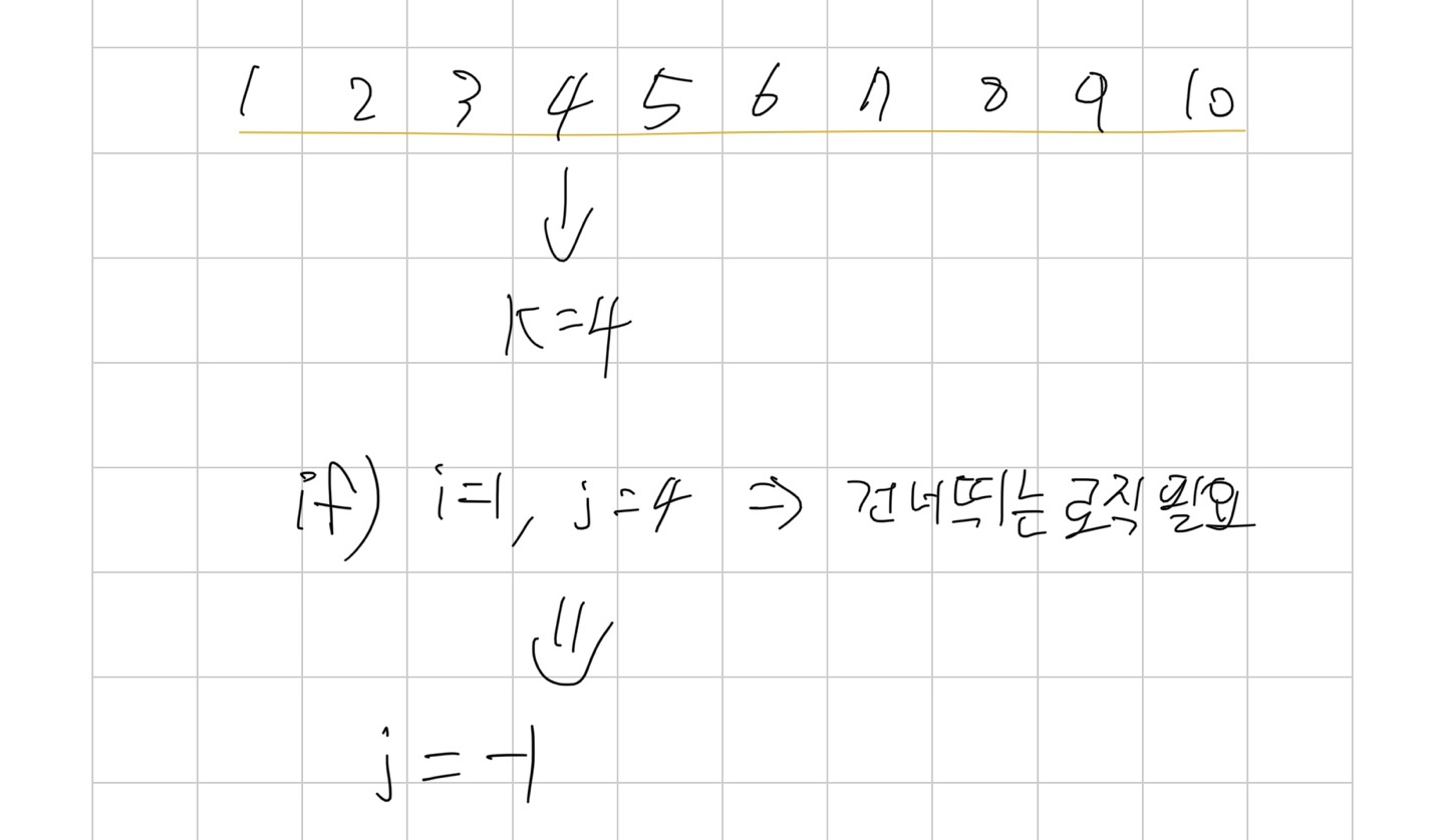 => j -1을 시키고 반복문의 조건으로 i >j를 설정하면 다음 while문에서 false를 띄우면서 다음 K 값을 가져오게 한다.
