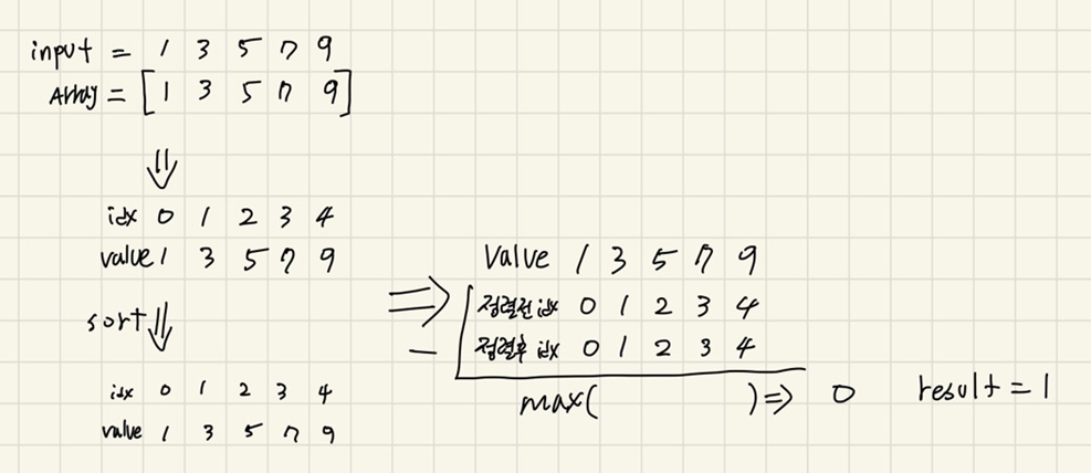 정렬전 idx - 정렬 후 idx한 값 중 max를 찾아 마지막으로 +1을 해주는 방식으로 구해질 수 있다.