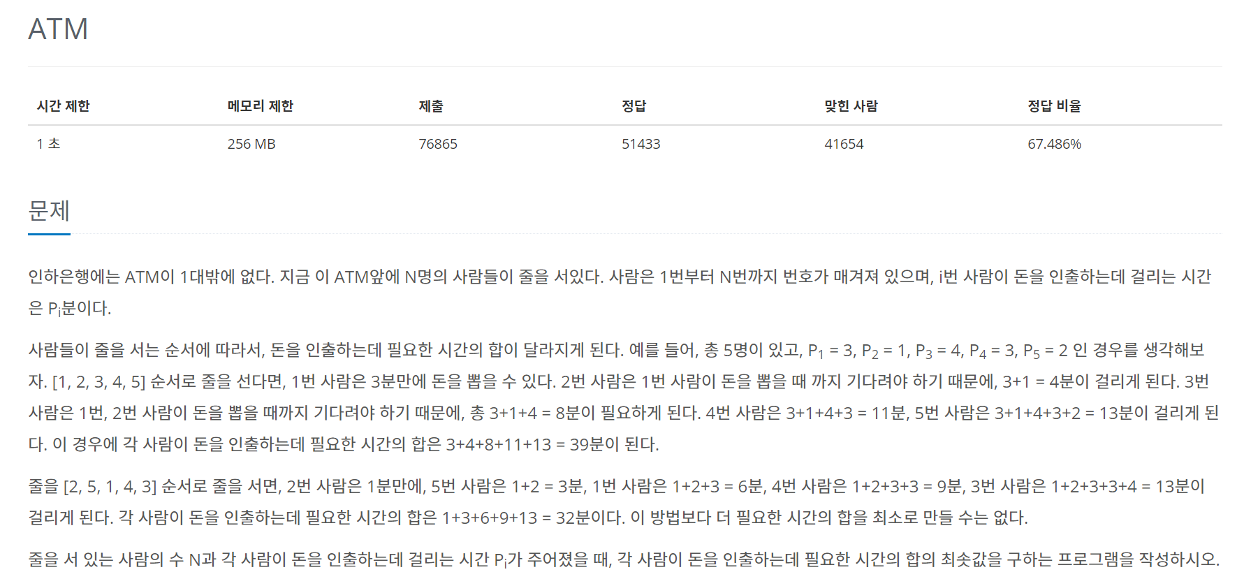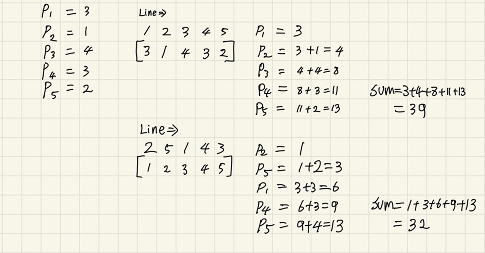 사람들이 줄을 서는 순서에 따라서, 돈을 인출하는데 필요한 시간의 합이 달라지게 된다. 예를 들어, 총 5명이 있고, P1 = 3, P2 = 1, P3 = 4, P4 = 3, P5 = 2 인 경우를 생각해보자. [1, 2, 3, 4, 5] 순서로 줄을 선다면, 1번 사람은 3분만에 돈을 뽑을 수 있다. 2번 사람은 1번 사람이 돈을 뽑을 때 까지 기다려야 하기 때문에, 3+1 = 4분이 걸리게 된다. 3번 사람은 1번, 2번 사람이 돈을 뽑을 때까지 기다려야 하기 때문에, 총 3+1+4 = 8분이 필요하게 된다. 4번 사람은 3+1+4+3 = 11분, 5번 사람은 3+1+4+3+2 = 13분이 걸리게 된다. 이 경우에 각 사람이 돈을 인출하는데 필요한 시간의 합은 3+4+8+11+13 = 39분이 된다.
