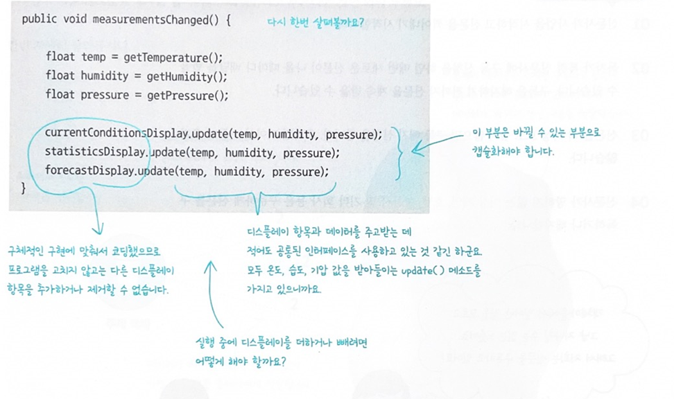주제가 옵저버로 데이터를 보내는 푸시(push)를 사용하거나 옵저버가 주제로부터 데이터를 당겨오는 풀(pull)을 사용하는 방법 중 어느 하나를 선택하는 일은 구현 방법의 문제라고 볼 수 있습니다. 하지만 대체로 옵저버가 필요한 데이터를 골라서 가져가도록 만드는 방법이 더 좋습니다. 시간이 지남에 따라 애플리케이션은 계속 바뀌고 점점 복잡해집니다. ... 옵저버가 필요한 데이터를 당겨올 수 있도록 기상 스테이션 코드를 수정하는 일은 그리 어렵지 않습니다. 주제가 자신의 데이터에 관한 게터 메소드를 가지게 만들고 필요한 데이터를 당겨올 때 해당 메소드를 호출할 수 있도록 옵저버를 고쳐주기만 하면 됩니다.