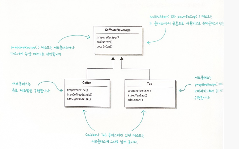 2. 어떤 알고리즘의 템플릿 역할을 합니다. 여기서는 카페인 음료를 만드는 알고리즘의 템플릿이죠.