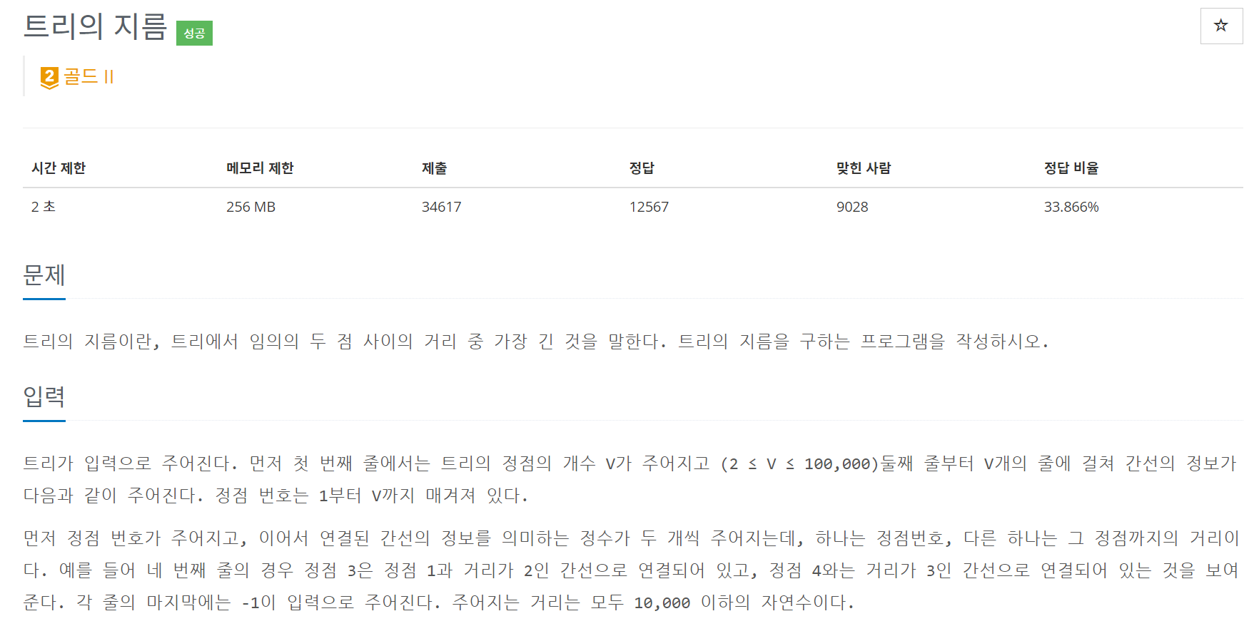 트리의 지름이란, 트리에서 임의의 두 점 사이의 거리 중 가장 긴 것을 말한다. 트리의 지름을 구하는 프로그램을 작성하시오.