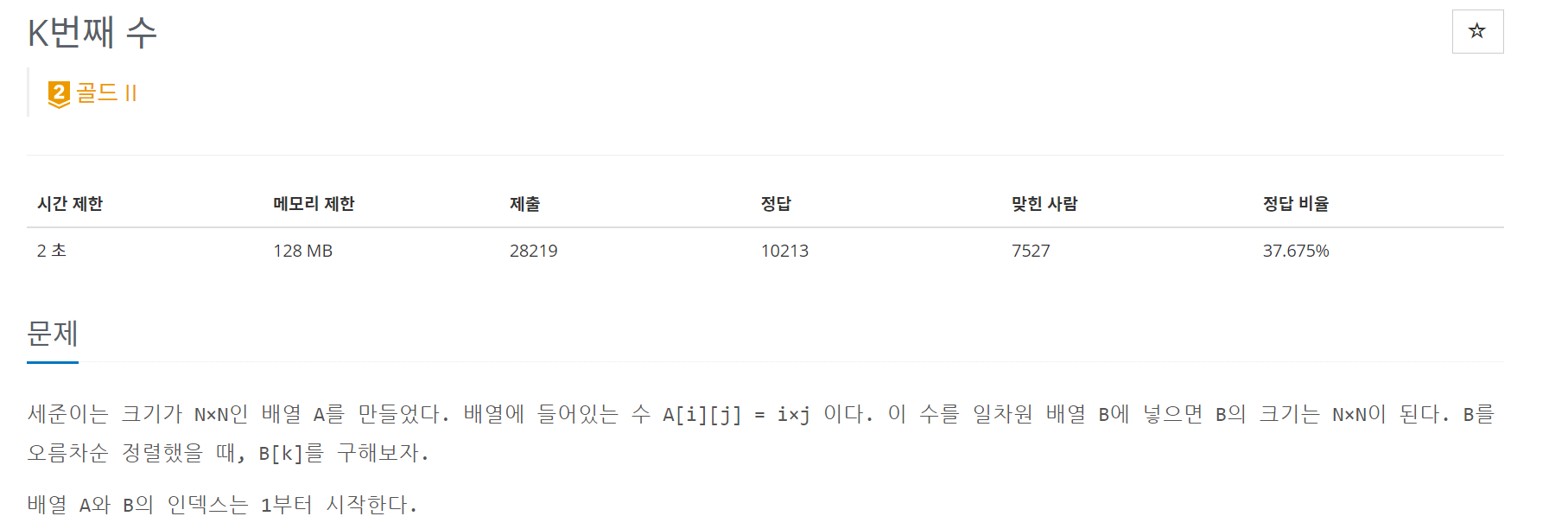 세준이는 크기가 N×N인 배열 A를 만들었다. 배열에 들어있는 수 A[i][j] = i×j 이다. 이 수를 일차원 배열 B에 넣으면 B의 크기는 N×N이 된다. B를 오름차순 정렬했을 때, B[k]를 구해보자.