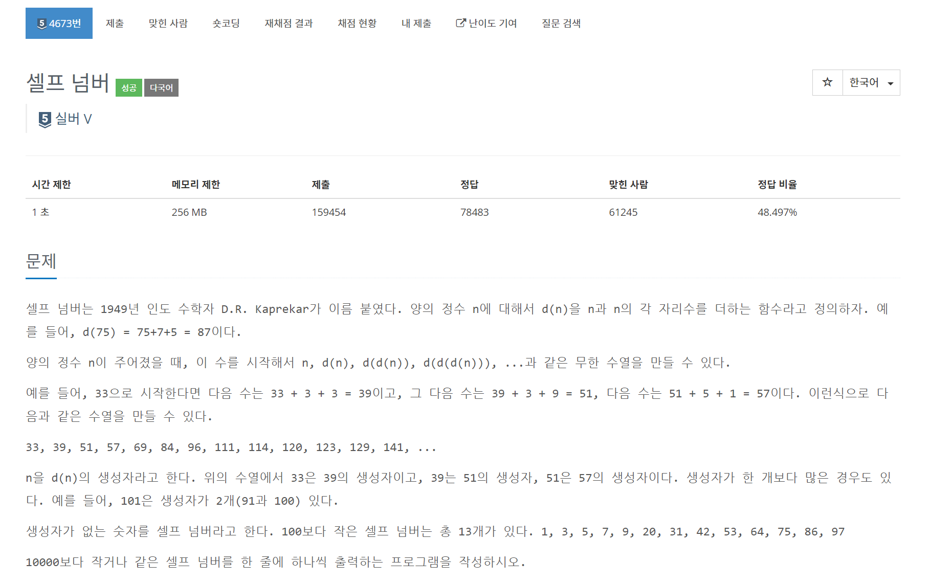 self 넘버를 바로 구하는 방식이 아닌 Kaprekar 넘버를 구한 뒤 1 ~ 10000수 중에 포함되지 않은 것을 검증하는 방식이다.