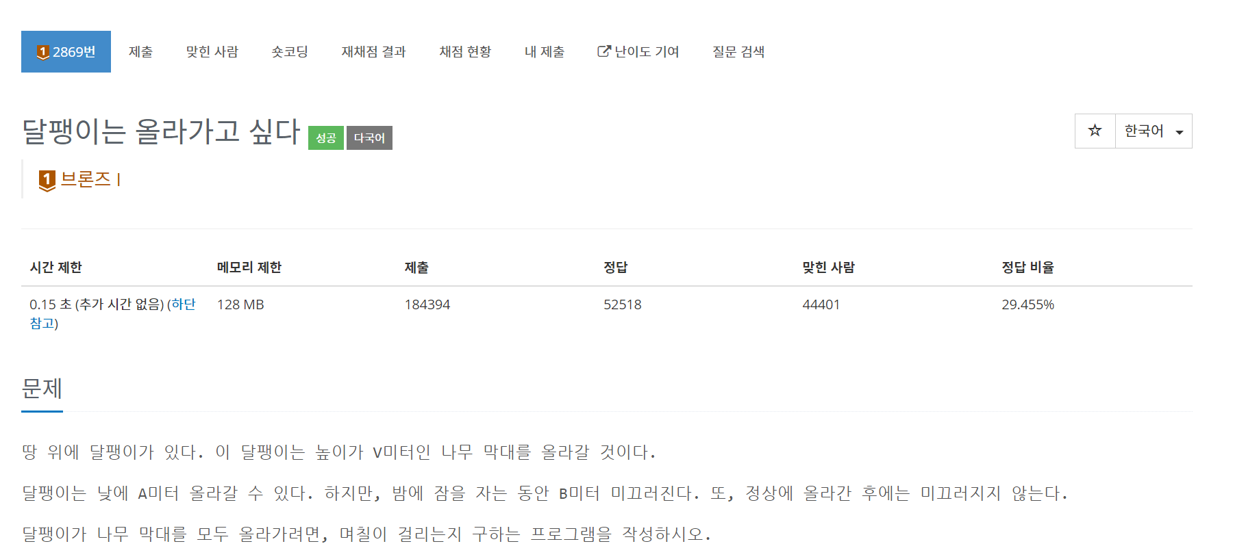 땅 위에 달팽이가 있다. 이 달팽이는 높이가 V미터인 나무 막대를 올라갈 것이다.