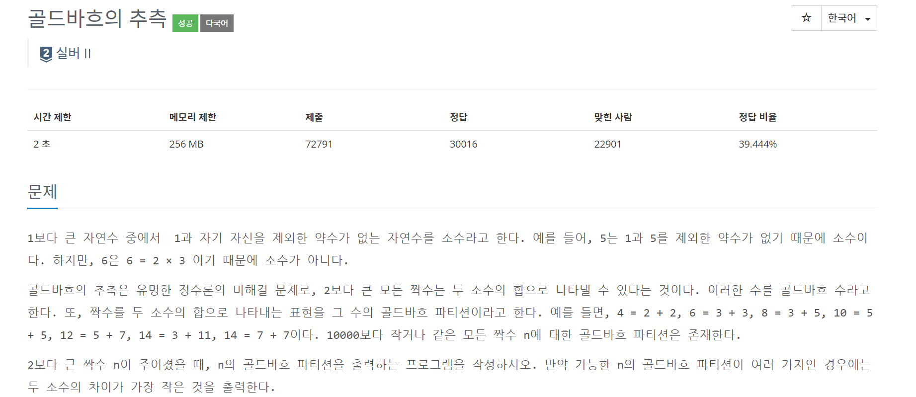 골드바흐의 추측은 유명한 정수론의 미해결 문제로, 2보다 큰 모든 짝수는 두 소수의 합으로 나타낼 수 있다는 것이다. 이러한 수를 골드바흐 수라고 한다. 또, 짝수를 두 소수의 합으로 나타내는 표현을 그 수의 골드바흐 파티션이라고 한다. 예를 들면, 4 = 2 + 2, 6 = 3 + 3, 8 = 3 + 5, 10 = 5 + 5, 12 = 5 + 7, 14 = 3 + 11, 14 = 7 + 7이다. 10000보다 작거나 같은 모든 짝수 n에 대한 골드바흐 파티션은 존재한다.