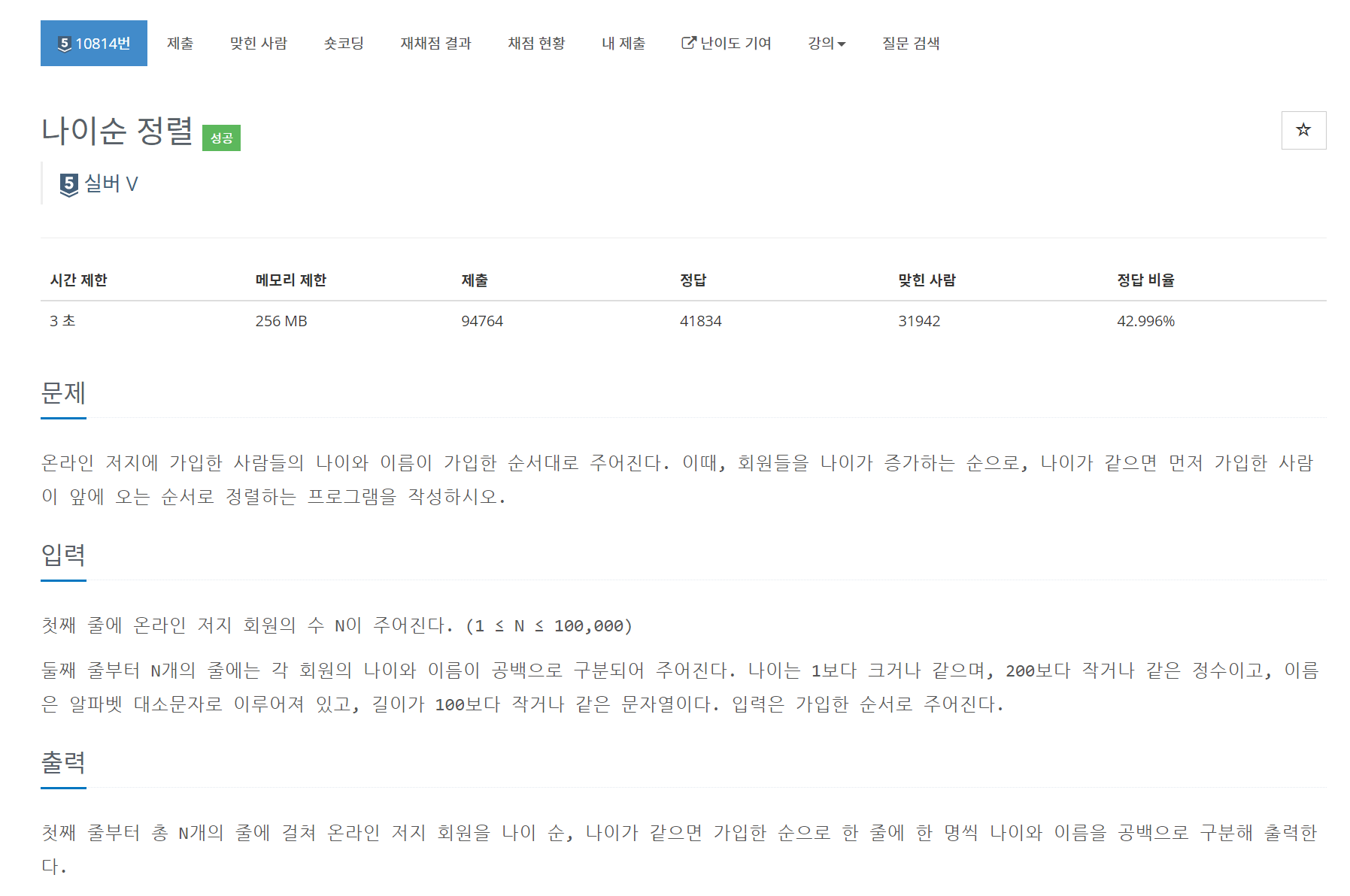 첫째 줄부터 총 N개의 줄에 걸쳐 온라인 저지 회원을 나이 순, 나이가 같으면 가입한 순으로 한 줄에 한 명씩 나이와 이름을 공백으로 구분해 출력한다.