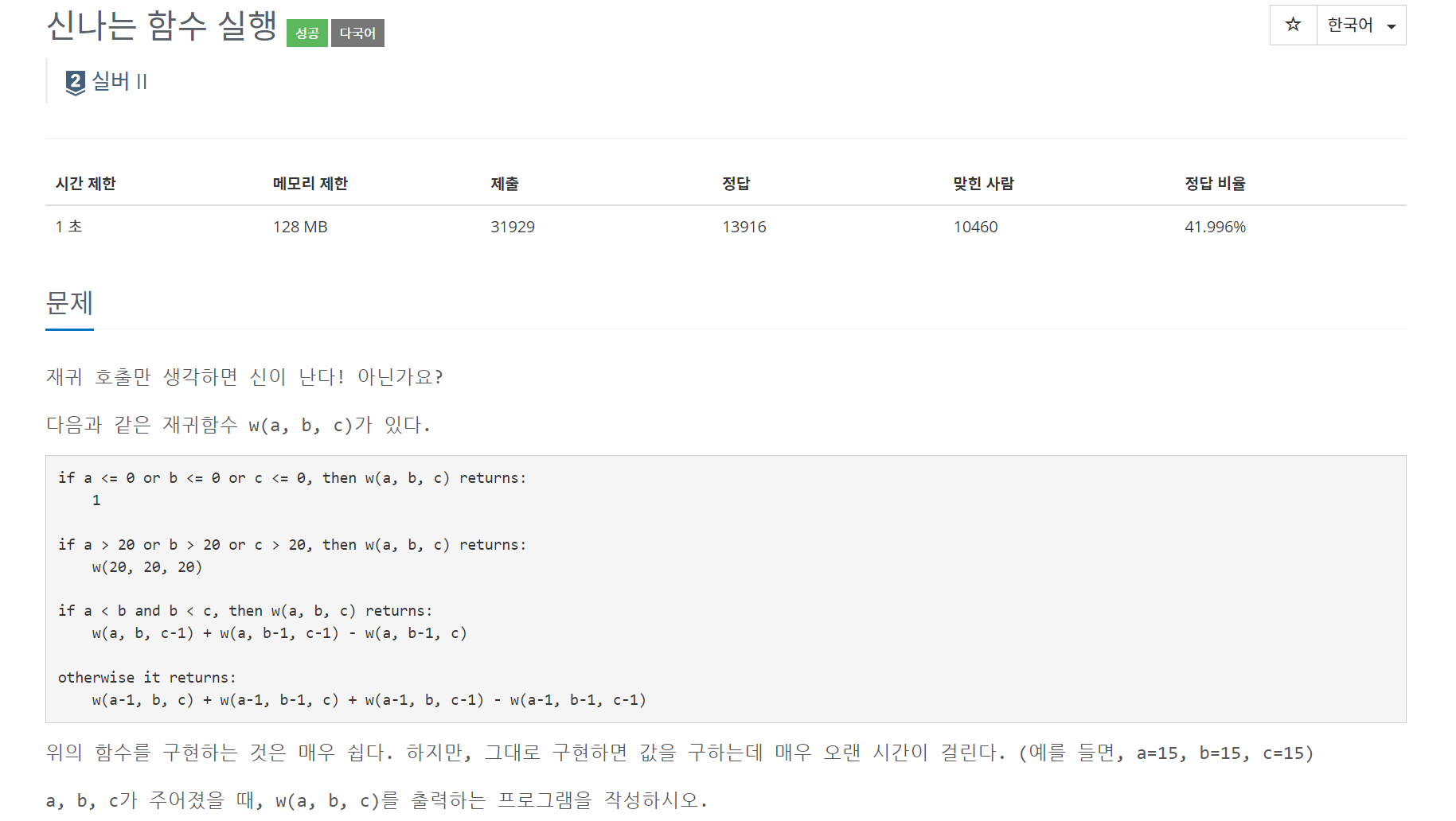위의 함수를 구현하는 것은 매우 쉽다. 하지만, 그대로 구현하면 값을 구하는데 매우 오랜 시간이 걸린다. (예를 들면, a=15, b=15, c=15) a, b, c가 주어졌을 때, w(a, b, c)를 출력하는 프로그램을 작성하시오.