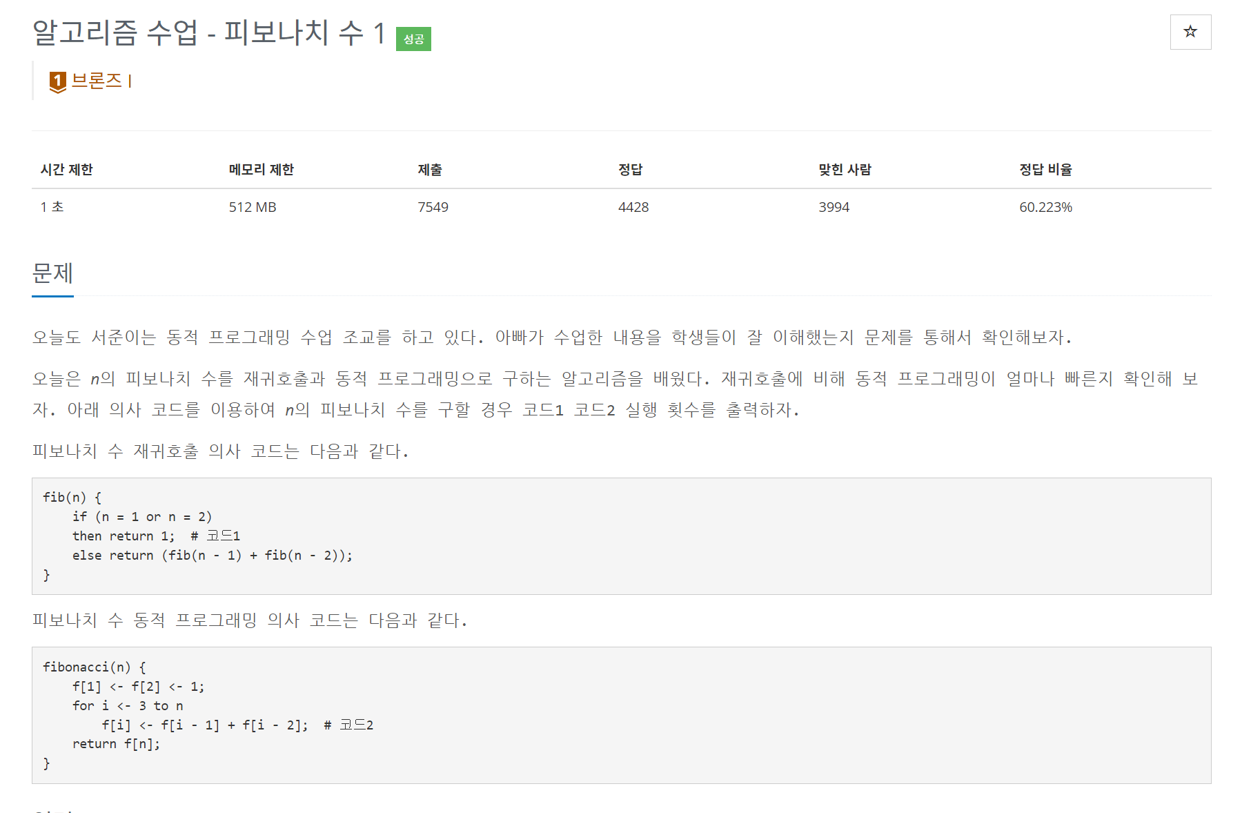 오늘은 n의 피보나치 수를 재귀호출과 동적 프로그래밍으로 구하는 알고리즘을 배웠다. 재귀호출에 비해 동적 프로그래밍이 얼마나 빠른지 확인해 보자. 아래 의사 코드를 이용하여 n의 피보나치 수를 구할 경우 코드1 코드2 실행 횟수를 출력하자.