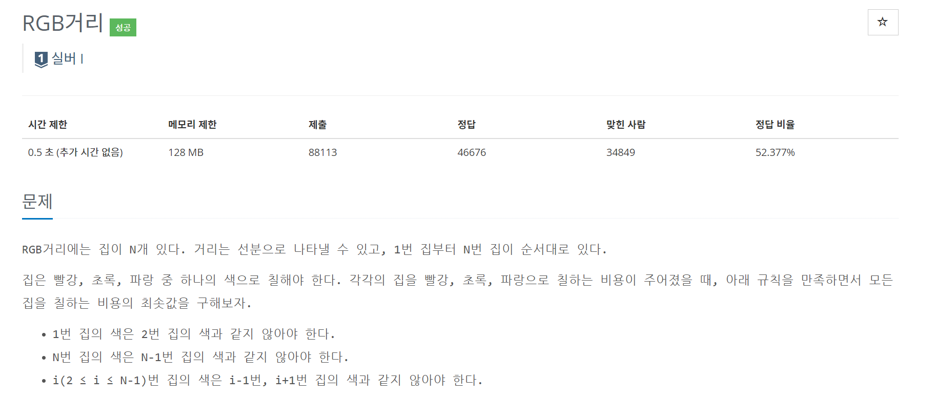 집은 빨강, 초록, 파랑 중 하나의 색으로 칠해야 한다. 각각의 집을 빨강, 초록, 파랑으로 칠하는 비용이 주어졌을 때, 아래 규칙을 만족하면서 모든 집을 칠하는 비용의 최솟값을 구해보자.