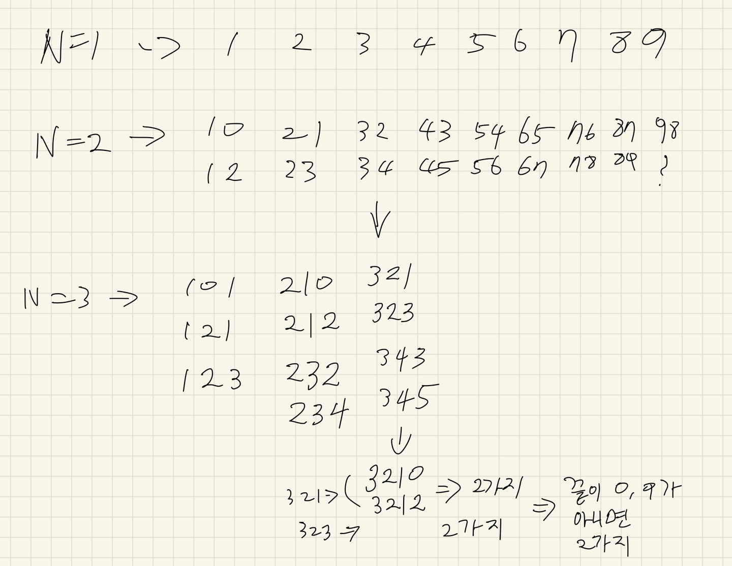 N이 주어질 때, 길이가 N인 계단 수가 총 몇 개 있는지 구해보자. 0으로 시작하는 수는 계단수가 아니다.