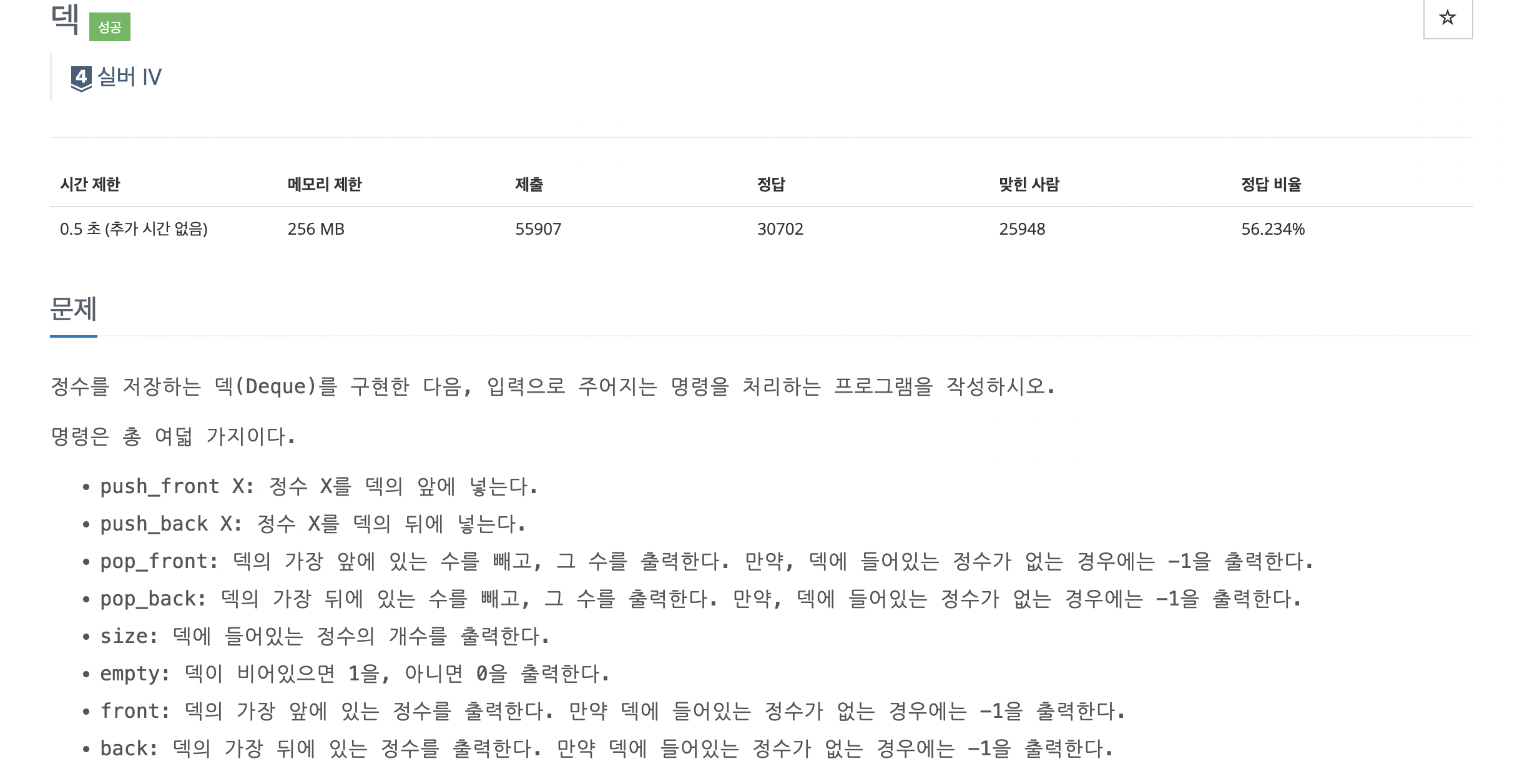 정수를 저장하는 덱(Deque)를 구현한 다음, 입력으로 주어지는 명령을 처리하는 프로그램을 작성하시오.