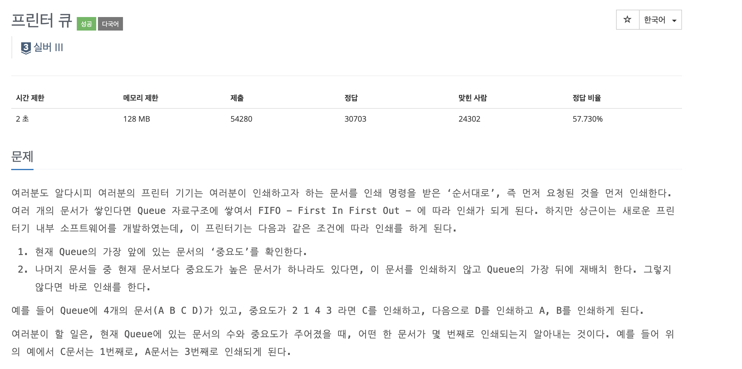 여러분이 할 일은, 현재 Queue에 있는 문서의 수와 중요도가 주어졌을 때, 어떤 한 문서가 몇 번째로 인쇄되는지 알아내는 것이다. 예를 들어 위의 예에서 C문서는 1번째로, A문서는 3번째로 인쇄되게 된다.