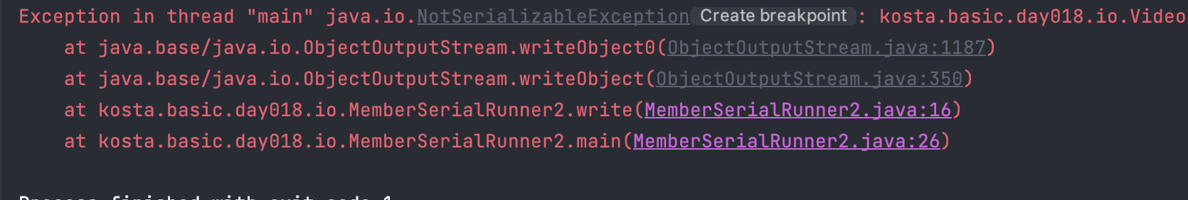 serializable을 구현하지 않은 것을 write 하려고 하면 exception이 발생한다.