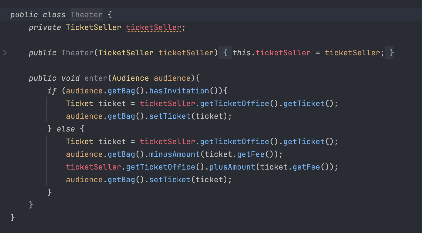 현실에서는 관람객이 직접 자신의 가방에서 초대장을 꺼내 판매원에게 건넨다. 티켓을 구매하는 관람객은 가방 안에서 돈을 직접 꺼내 판매원에게 지불한다. 판매원은 매표소에 있는 티켓을 직접 꺼내 관람객에게 건네고 관람객에서 직접 돈을 받아 매표소에 보관한다. 하지만 코드 안의 관람객, 판매원은 그렇게 하지 않는다. 현재의 코드는 우리의 상식과는 너무나도 다르게 동작하기 때문에 코드를 읽는 사람과 제대로 의사소통하지 못한다.