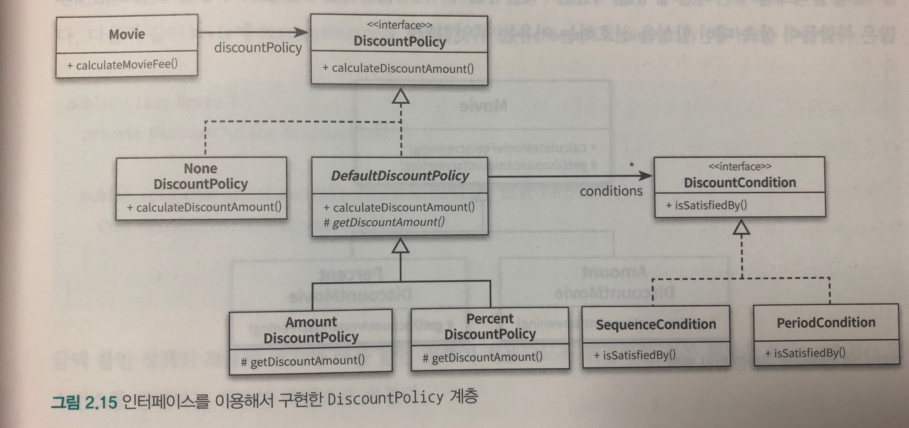 Movie가 DiscountPolicy의 인터페이스에 정의된 calculateDiscountAmount 메시지를 전송하고 있다. DiscountPolicy를 상속받는 AmountDiscountPolicy와 PercentDiscountPolicy의 인터페이스에도 이 오퍼레이션이 포함돼 있다는 사실에 주목하라. Movie 이장에서는 자신과 협력하는 객체가 어떤 클래스의 인스턴스인지가 중요한 것이 아니라 calcualteDiscountAmount 메시지를 수신할 수 있다는 사실이 중요하다. 다시 말해 Movie는 협력 객체가 calculateDiscountAmount라는 메시지를 이해할 수만 있다면 그 객체가 어떤 클래스의 인스턴스인지는 상관하지 않는다는 것이다. 따라서 calcualteDiscountAmount 메시지를 수신할 수 있는 AmountDiscountPolicy와 PercentDiscountPolicy 모두 DiscountPolicy를 대신해서 movie와 협력할 수 있다.