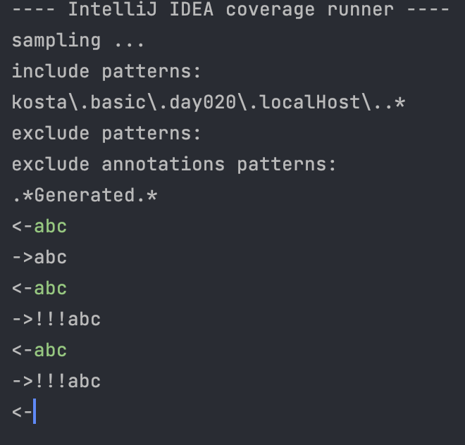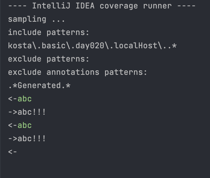 문제는 입력시 개행문자("\n")이 찍혀서 함께 바이트 배열에 저장이 되었기 때문. outputStream에서 읽을 때 개행문자를 기준으로 읽는다. 그래서 해당 값 이전까지만 읽고 이미 생성된 이후에 추가된 "!!!"메시지는 다음 버퍼로 넘어가서 대기 상태로 존재하고 그렇기 때문에 다음 출력 때 함께 출력이 되는 것을 확인했다.