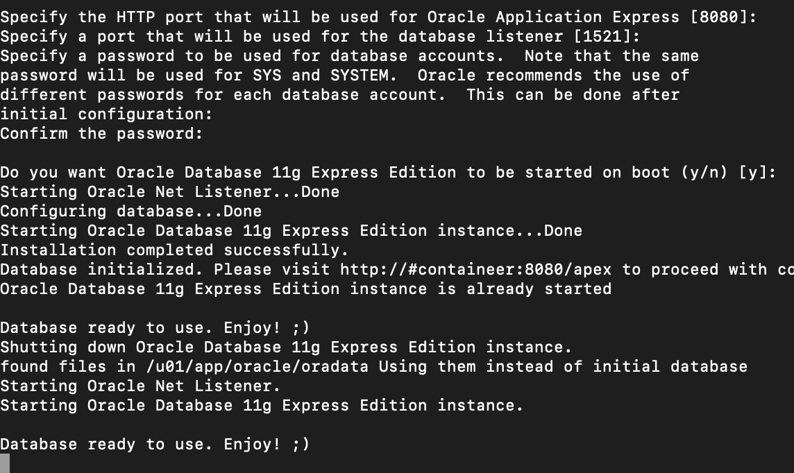 docker run --name oracle11g -d -p 8080:8080 -p 1521:1521 -v ~/my/oracle/data jaspeen/oracle-xe-11g