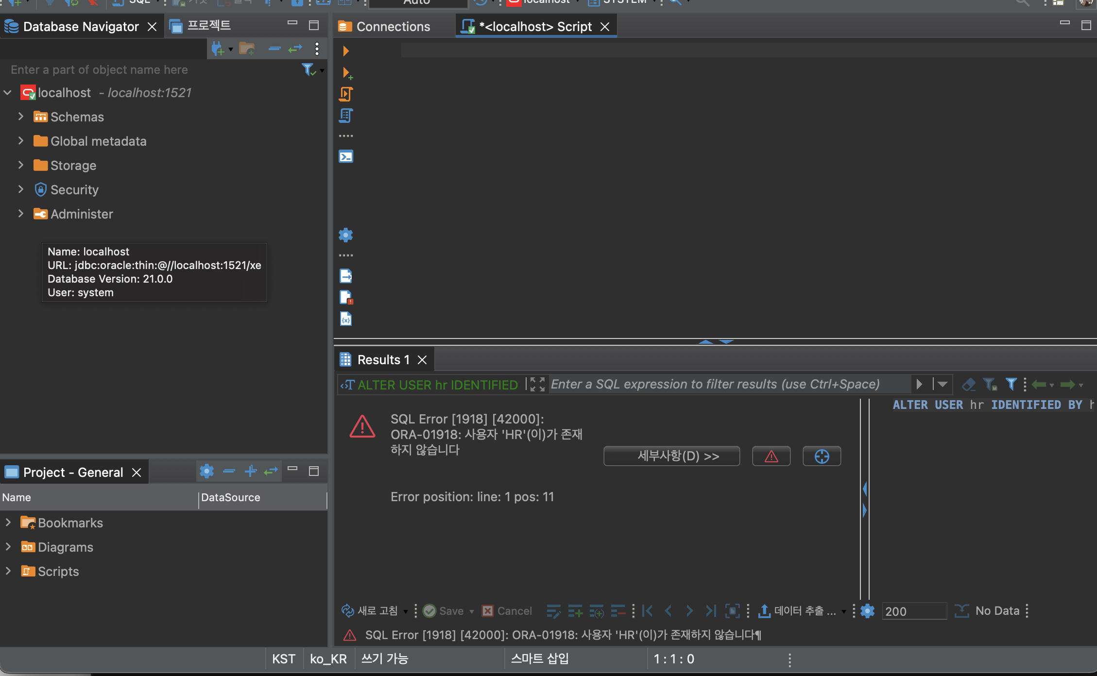 오라클에서 hr 언락하고 비밀번호 변경하여 사용하는 법