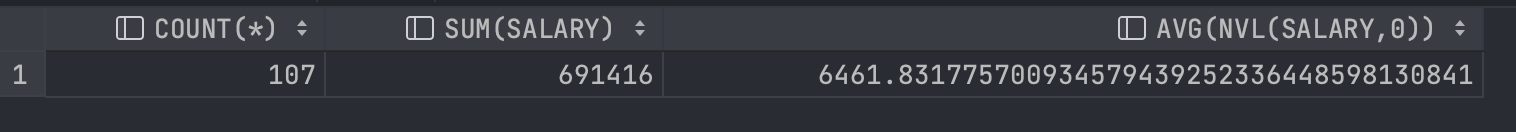 select count(*), sum(SALARY), avg(nvl(SALARY,0))