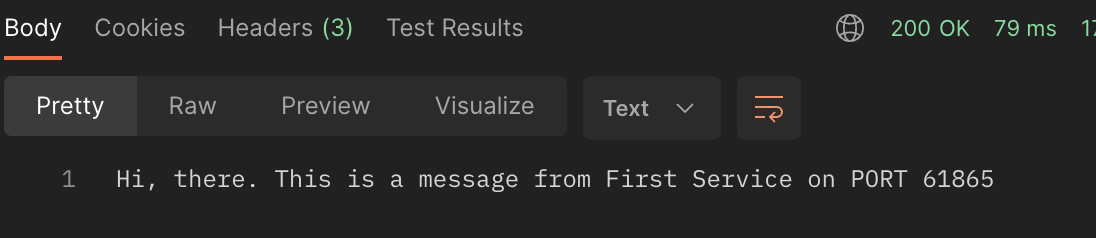 return String.format("Hi, there. This is a message from First Service on PORT %s"