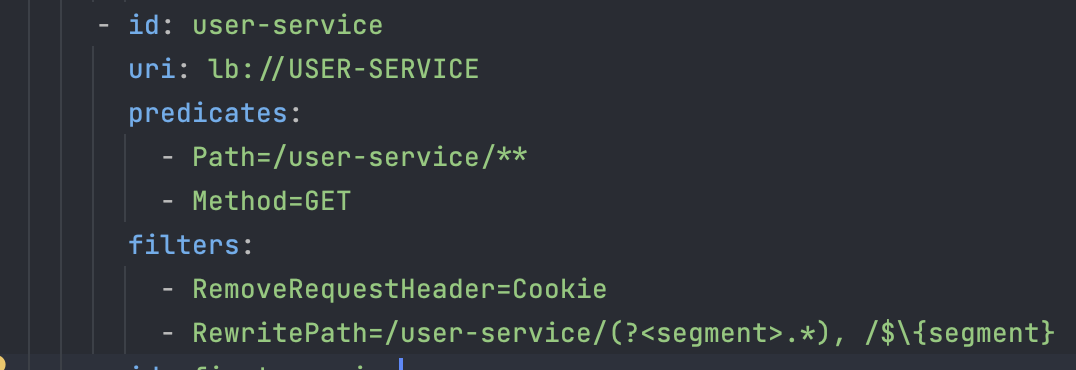 - RewritePath=/user-service/(?<segment>.*), /$\{segment}