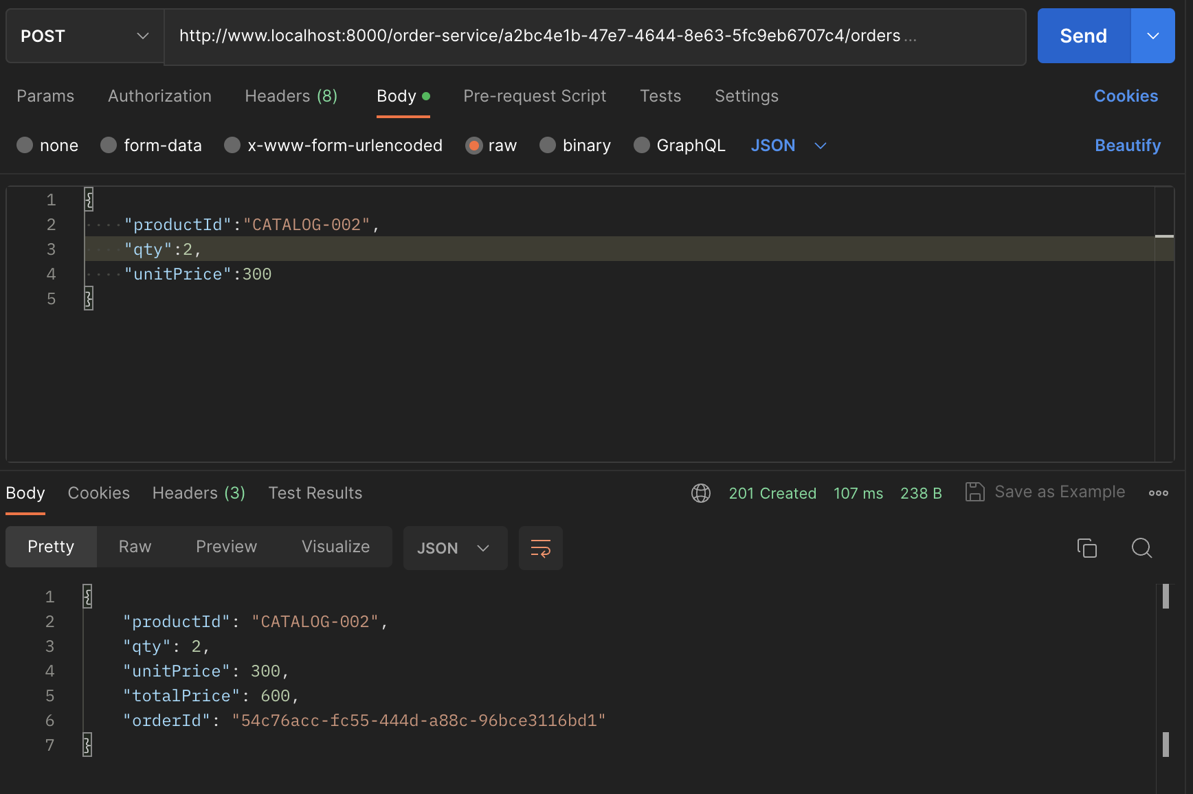 다음과 같이 order-service에 주문을 넣어준다. 5개를 주문한다.