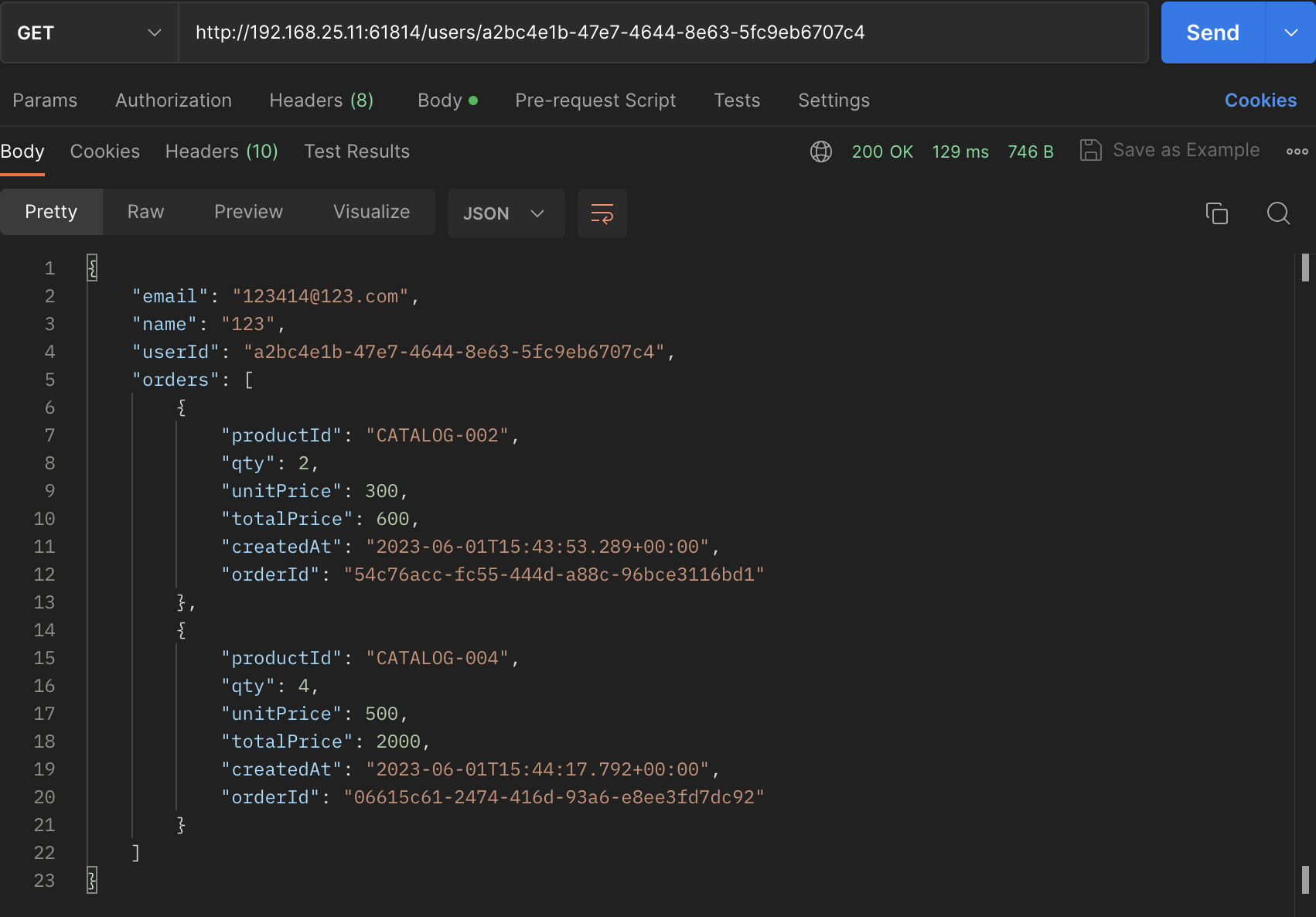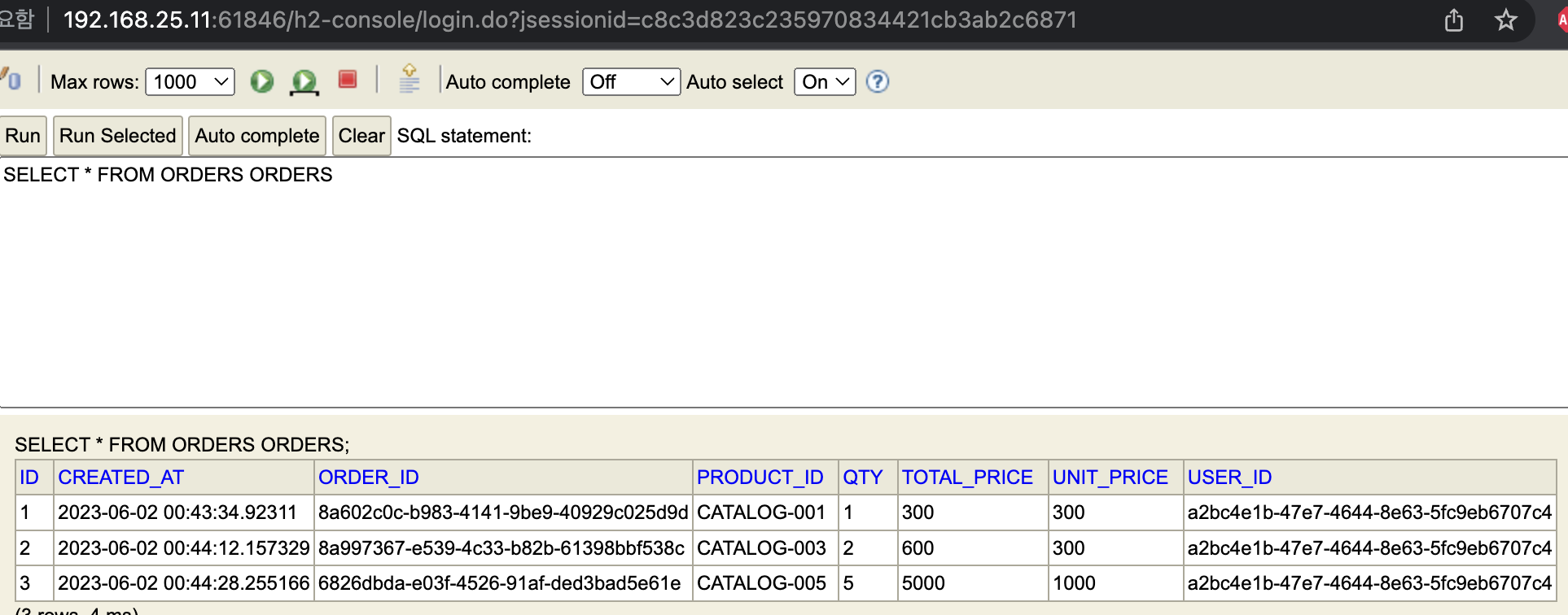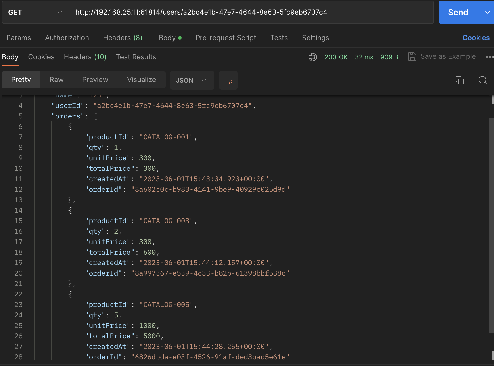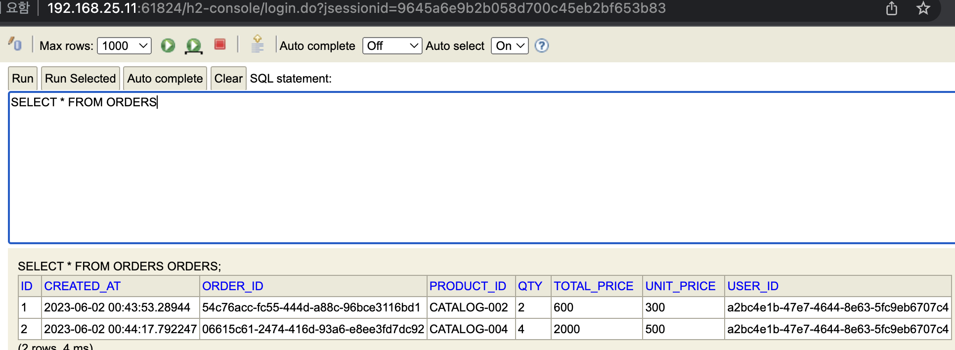 이때 사용자 정보를 요청하면 다음과 같이 두 개의 주문만 가져온다.