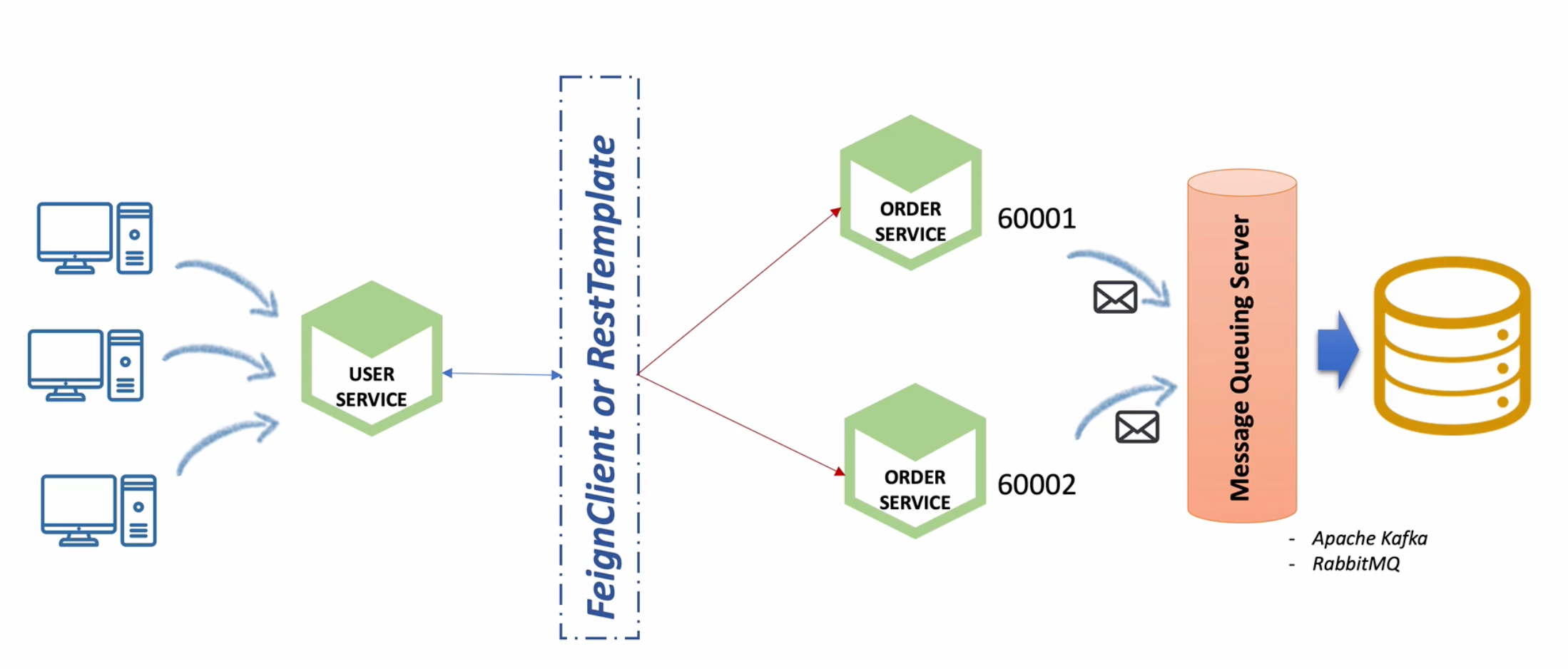db - order service -> message Queing Service (Kafka) <- consumer service - db