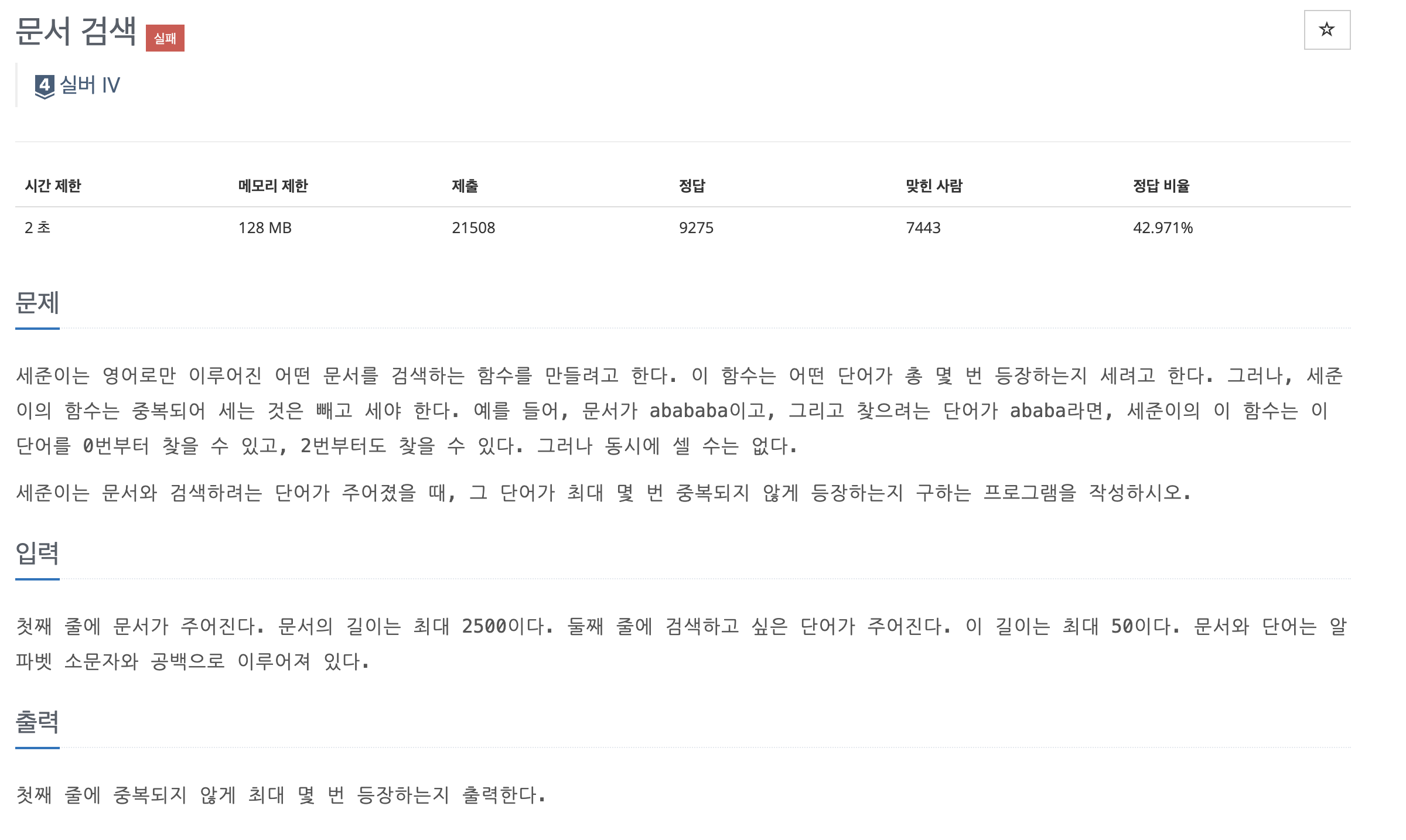 세준이는 영어로만 이루어진 어떤 문서를 검색하는 함수를 만들려고 한다. 이 함수는 어떤 단어가 총 몇 번 등장하는지 세려고 한다. 그러나, 세준이의 함수는 중복되어 세는 것은 빼고 세야 한다. 예를 들어, 문서가 abababa이고, 그리고 찾으려는 단어가 ababa라면, 세준이의 이 함수는 이 단어를 0번부터 찾을 수 있고, 2번부터도 찾을 수 있다. 그러나 동시에 셀 수는 없다.