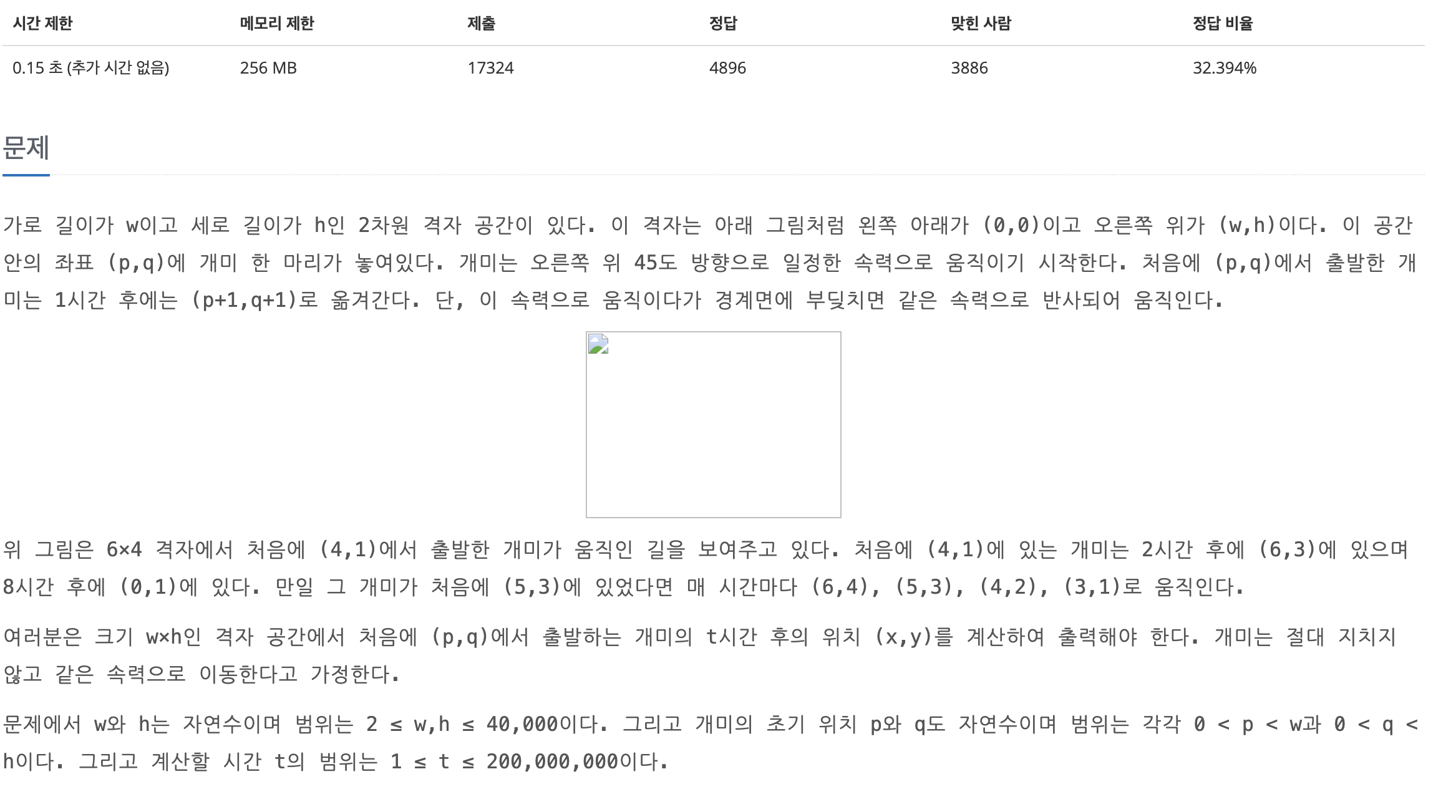 문제에서 w와 h는 자연수이며 범위는 2 ≤ w,h ≤ 40,000이다. 그리고 개미의 초기 위치 p와 q도 자연수이며 범위는 각각 0 < p < w과 0 < q < h이다. 그리고 계산할 시간 t의 범위는 1 ≤ t ≤ 200,000,000이다.
