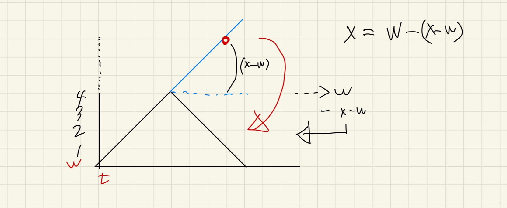 사이클이 w * 2 인 함수이므로 초기 시작 지점 p 와 시간 t 를 더한 값에 w * 2를 모듈러 연산을 하면