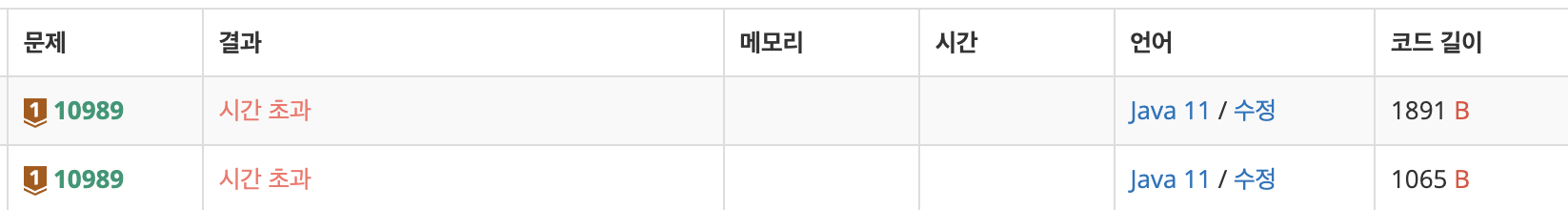 따라서 이 코드의 시간 복잡도는 대략적으로 O(N^2)이다. 입력된 수의 개수가 10,000,000개인 경우, 최악의 경우 100,000,000,000,000번의 연산이 필요하게 되므로 시간 초과가 발생하게 된다.
