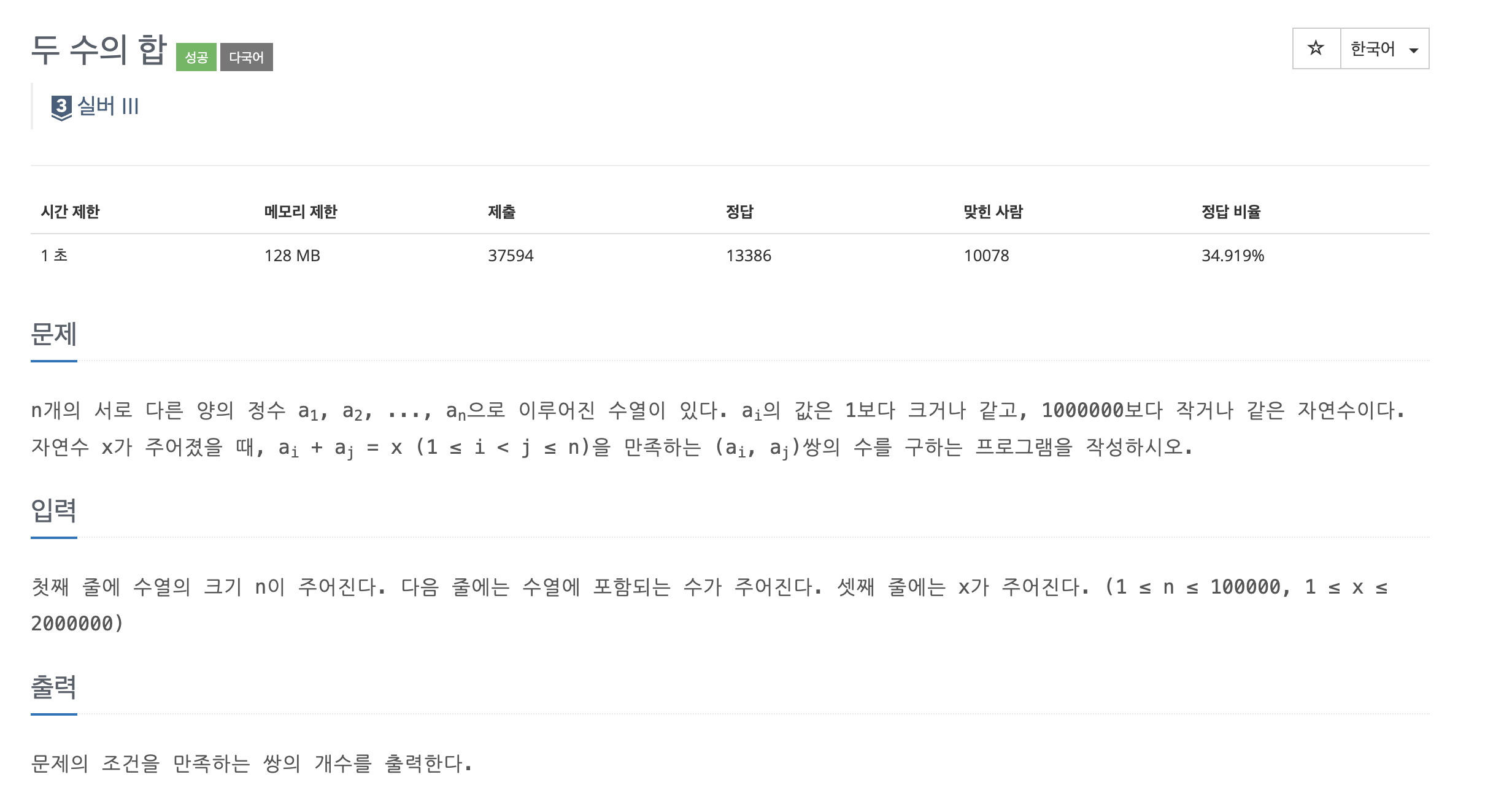 따라서 단순 모든 탐색으로 풀면 안되고 선정렬 후 정렬된 데이터의 특성을 이용해 합 경우의 수를 까져야 한다.