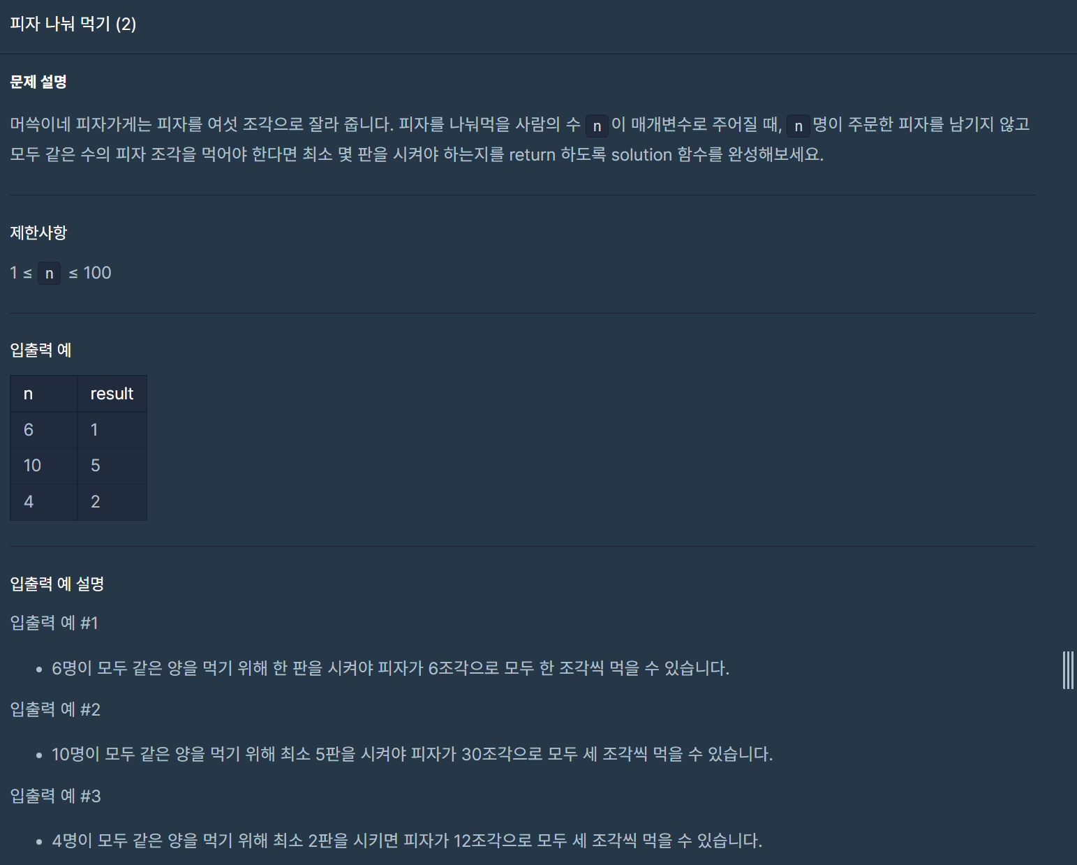 명이 주문한 피자를 남기지 않고 모두 같은 수의 피자 조각을 먹어야 한다면 최소 몇 판을 시켜야 하는지를 return 하도록 solution 함수를 완성해보세요.
