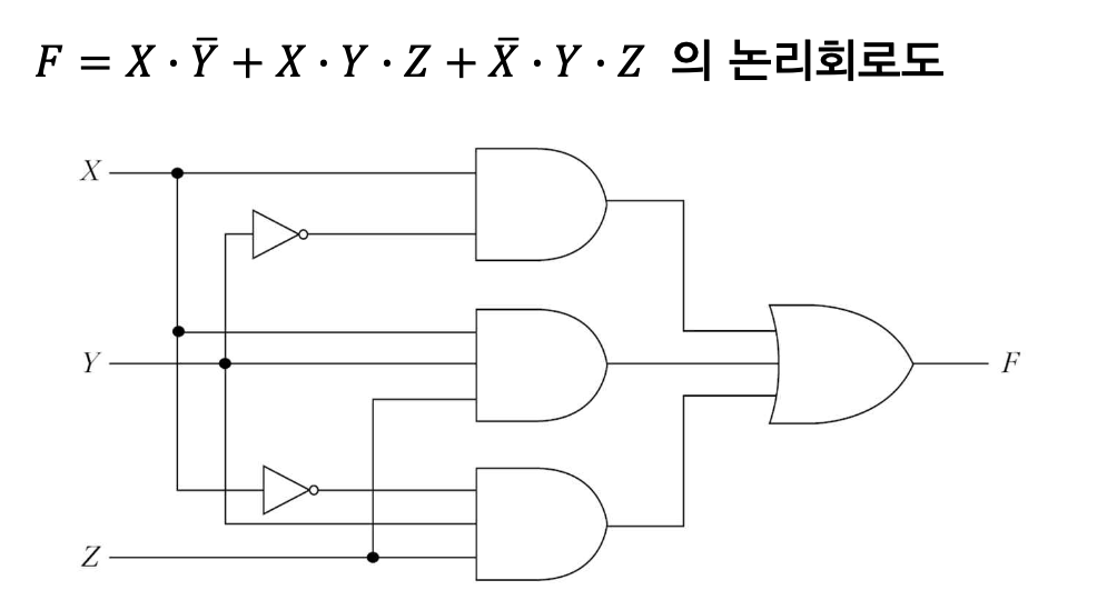 - 부울 함수는 논리 게이트들로 구성되는 논리회로도를 작성 가능하게 한다.