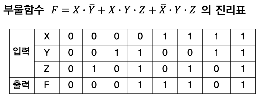 - 그러나 동일 진리표를 만족하는 부울 함수는 여러 개가 될 수 있다.