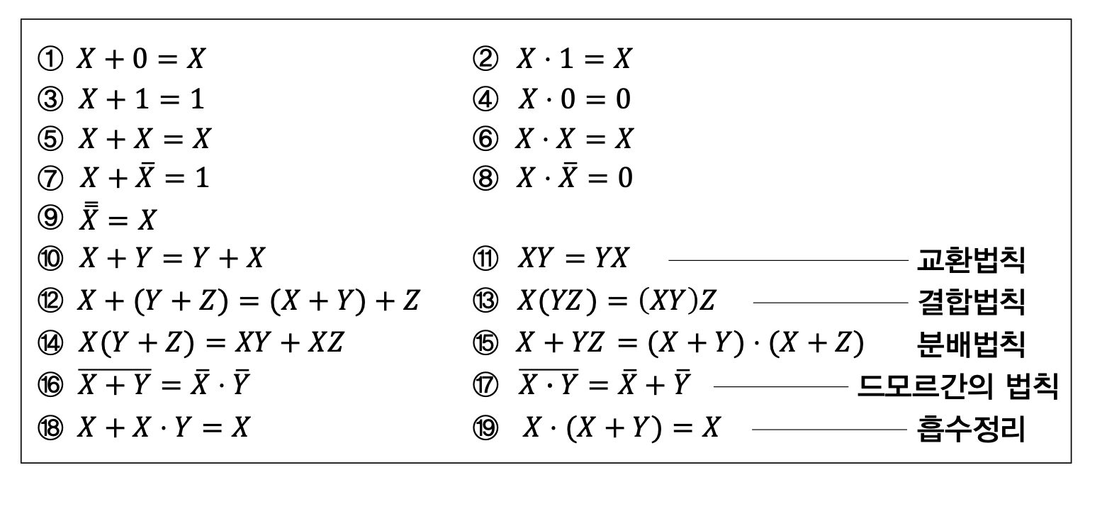 - 0과 1의 값을 갖는 논리변수와 논리연산을 다루는 대수