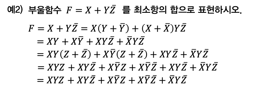 - 부울 함수를 최소항의 합(Sum of Minterm) 이나 최대항의 곱(Product of Maxterm) 으로 표현한 것